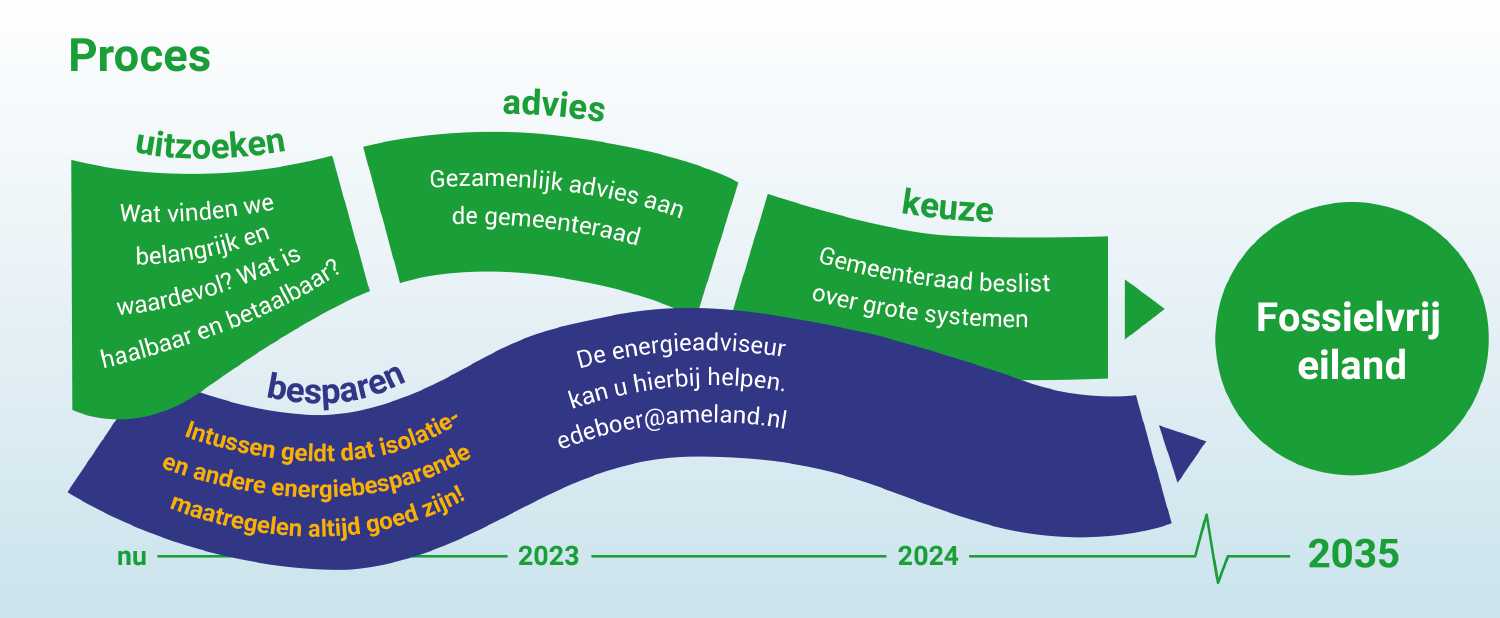 De weg naar aardgasvrij is complex. Amelanders hebben daarin de belangrijkste stem. Hun wensen, mogelijkheden en ideeën staan centraal bij het beoordelen en analyseren van de opties. Begin 2023 vonden in de vier dorpen op Ameland dorpsgesprekken plaats. Dit zal worden vervolgd. De gemeente houdt inwoners hierover op de hoogte. De inbreng en inzichten leiden uiteindelijk tot een advies aan de gemeenteraad van Ameland.